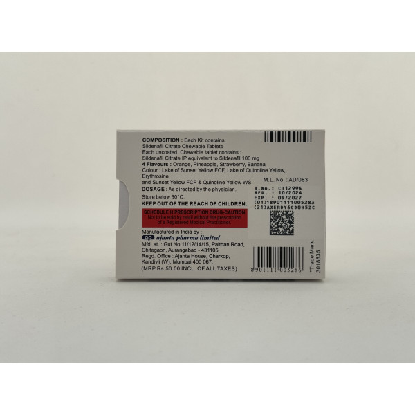 The widely known erectile dysfunction medication Viagra has a generic alternative: KAMAGRA 100 CHEWABLE. Manufactured by the reputable Indian pharmaceutical company Ajanta Pharma, it contains the active ingredient sildenafil citrate.