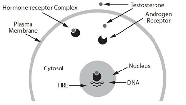 CELLULAR DIAGRAM: Testosterone freely diffuses through the plasma membrane and binds with an intracellular androgen receptor.